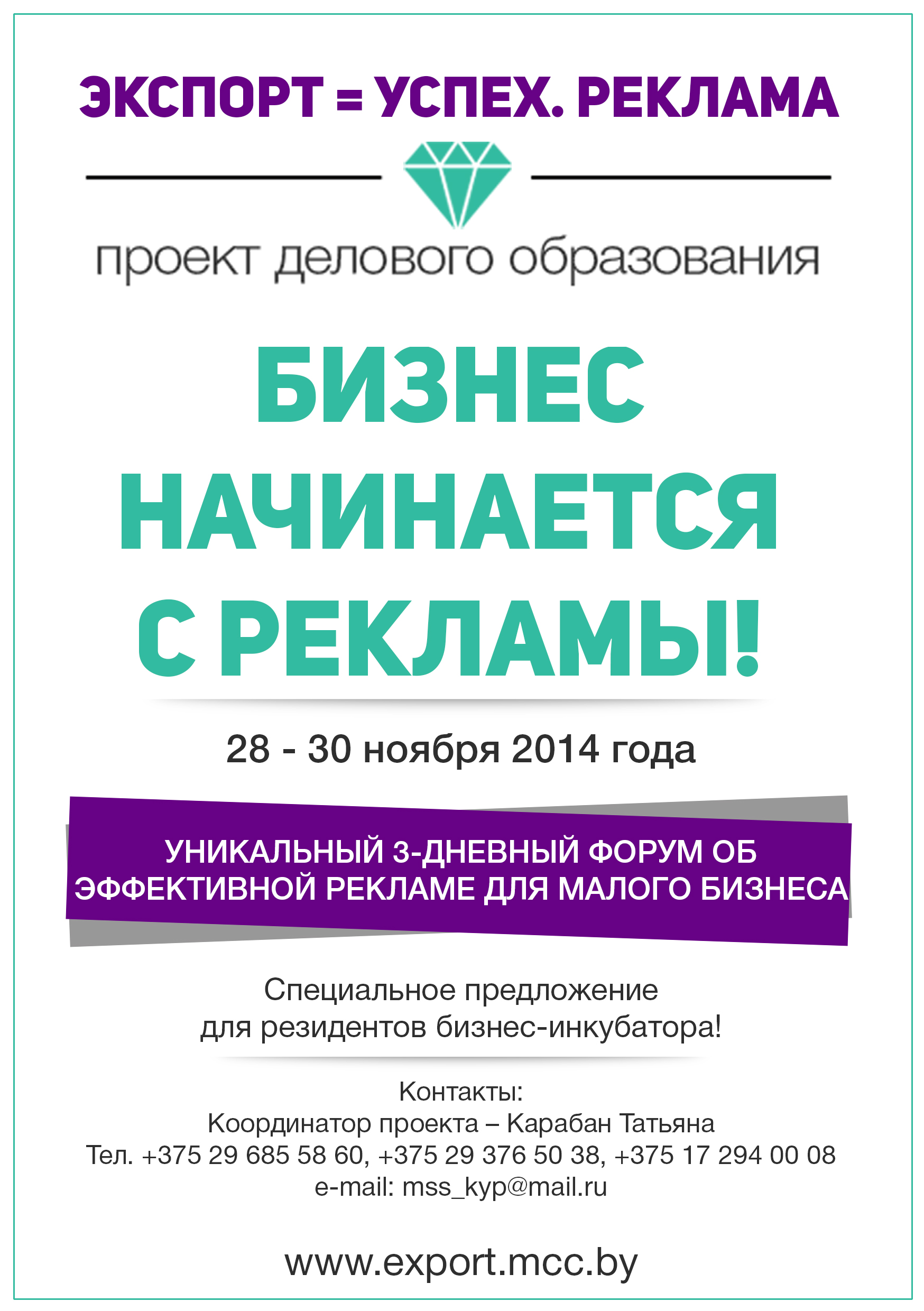 С 28 по 30 ноября в Молодёжном бизнес-инкубаторе совместно с Минским городским исполнительным комитетом пройдёт проект делового образования «Экспорт=Успех.РЕКЛАМА», с целью продвижения новаторских решений в рекламе, а также продуктивного нетворкинга (кооперации) между представителями индустрии рекламы.